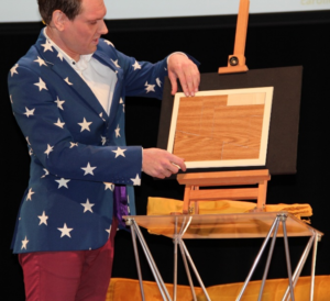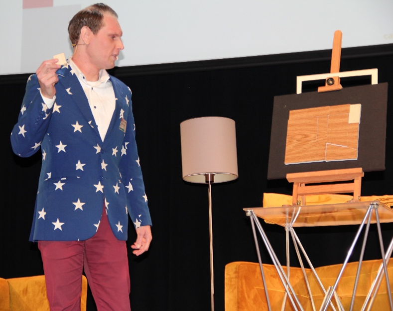 Na de lunch stond er een “intermezzo” op het programma. Dit leek een vreemd onderdeel. Een kunstenaar, die bouwstenen van hout uit het bos vond en daar een kunstwerk met een bijpassende lijst van maakte. Het was een mooi passend kunstwerk met gelijksoortige houten stukken, die qua vorm precies in elkaar en in het lijstje pasten.